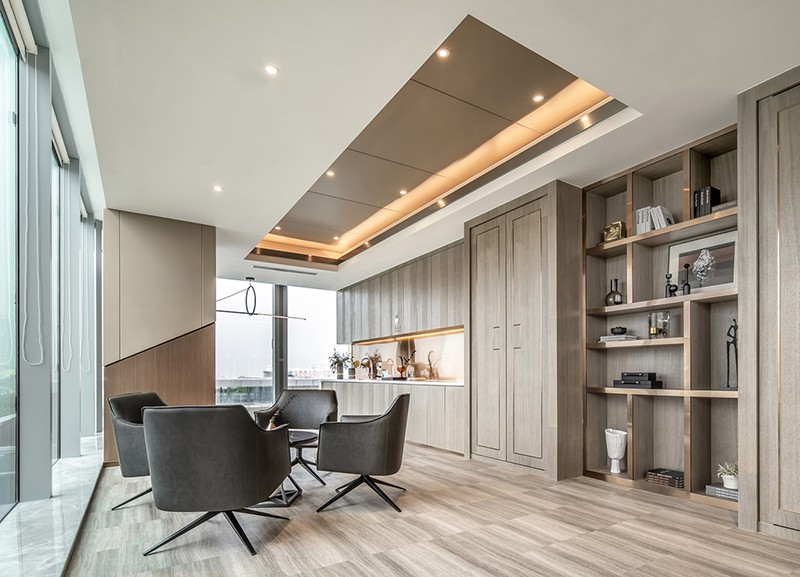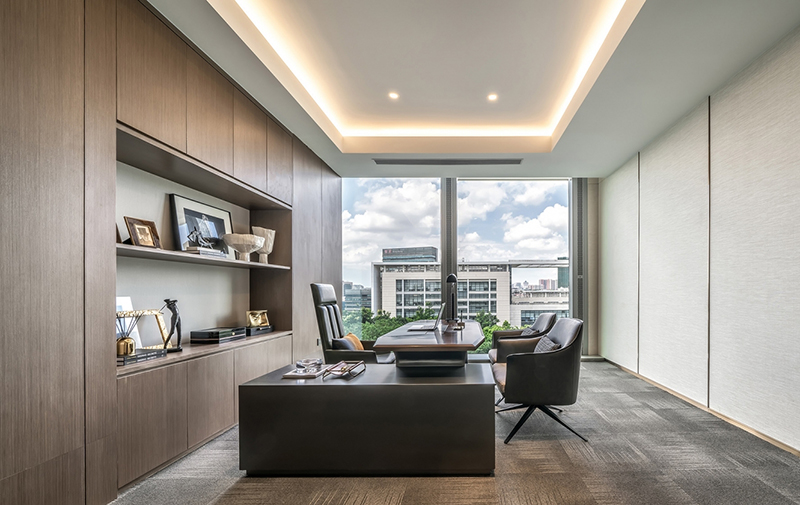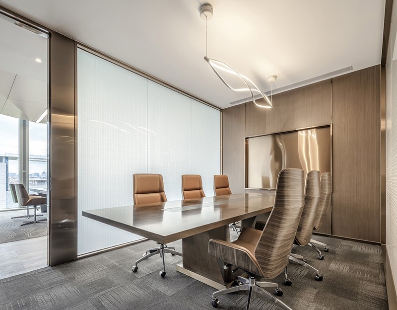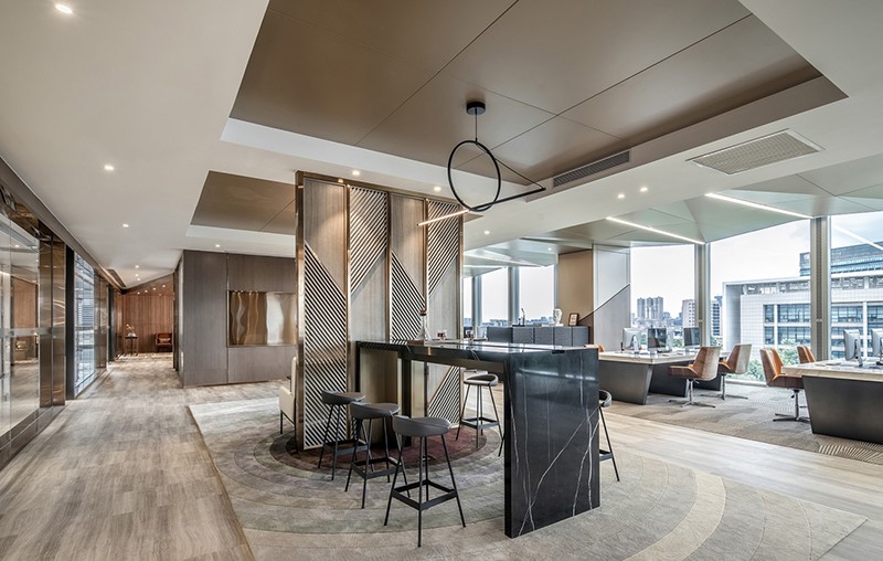 辦公空間的整體動線布局,以人為本。運用暖系色調(diào)融合啡色作為點綴,質(zhì)感豐富,對比分明,體現(xiàn)了大都會的時代感。大氣及細致并存,將建筑與藝術(shù)結(jié)合,展現(xiàn)剛?cè)岵⒅兀烙^與實用兼?zhèn)涞霓k公空間。
