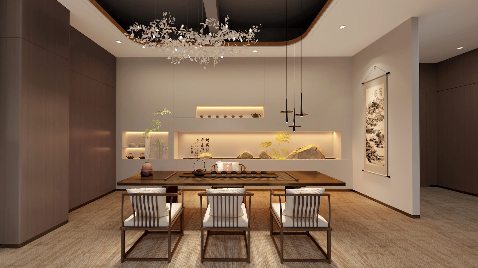 辦公區(qū)域延續(xù)采用了新中式的設(shè)計(jì)風(fēng)格,簡化了繁雜的裝飾,加入了少量的幾何元素進(jìn)行點(diǎn)綴,為古典文藝的辦公空間融入了商務(wù)元素,同時(shí)也滿足了現(xiàn)代辦公的功能性和審美需求,創(chuàng)造出一個(gè)既典雅又高效的工作環(huán)境。