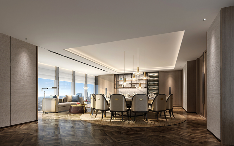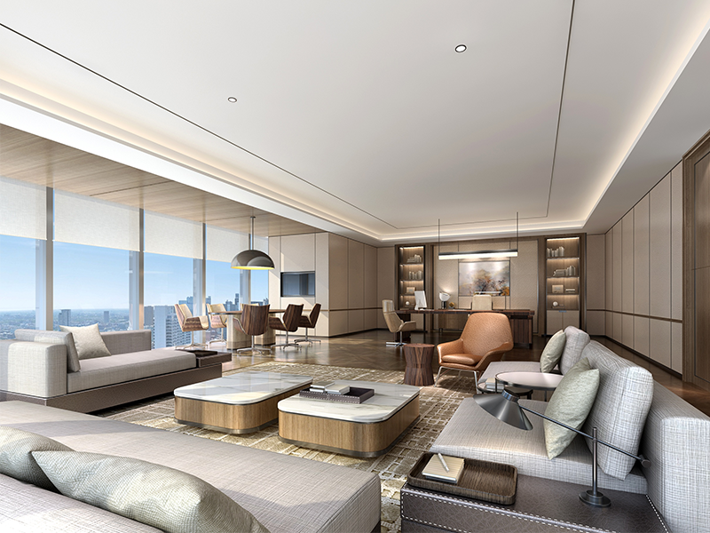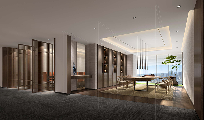 本方案的設(shè)計(jì)強(qiáng)調(diào)傳統(tǒng)文化與現(xiàn)代審美的結(jié)合,既保留中式的典雅與韻味,又融入現(xiàn)代設(shè)計(jì)的簡約與時(shí)尚,通過巧妙的布局和隔斷,使用中式屏風(fēng)、工藝隔斷、簡約博古架等,增強(qiáng)空間的層次感和流動(dòng)性,使空間更加靈動(dòng)通透。且多種形式的接待空間,滿足不同形式的商務(wù)接待場(chǎng)景。