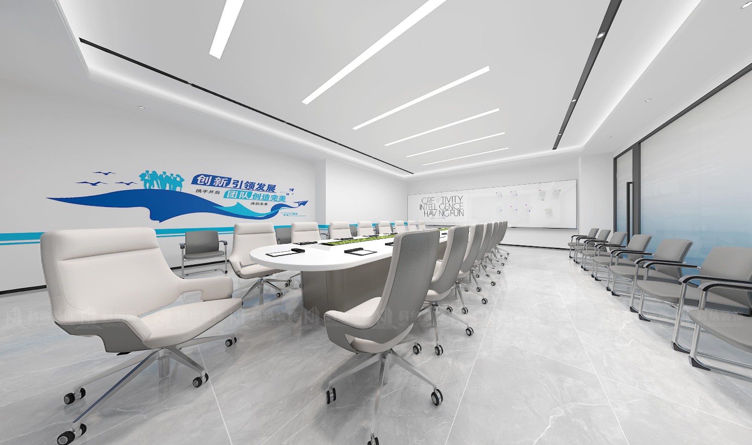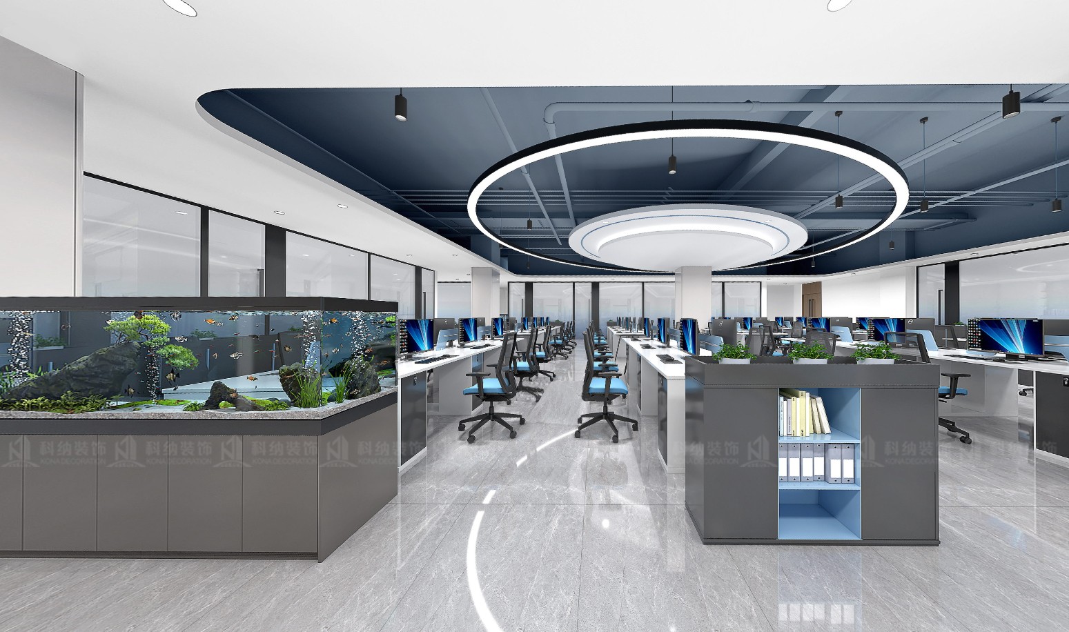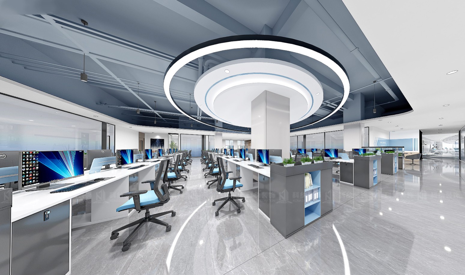設(shè)計(jì)理念:本方案采用極簡(jiǎn)的設(shè)計(jì)手法,融合科技元素,選用現(xiàn)代新型材料和中性色調(diào),搭配動(dòng)態(tài)照明,營(yíng)造出專業(yè)活力的辦公氛圍。通透的玻璃墻設(shè)計(jì),冷色調(diào)主調(diào)搭配流暢的天花板線條,再加上獨(dú)特的燈光設(shè)計(jì),營(yíng)造出滿滿的未來感。整體的辦公空間強(qiáng)調(diào)開放性、靈活性體更彰顯出了企業(yè)的創(chuàng)新形象。