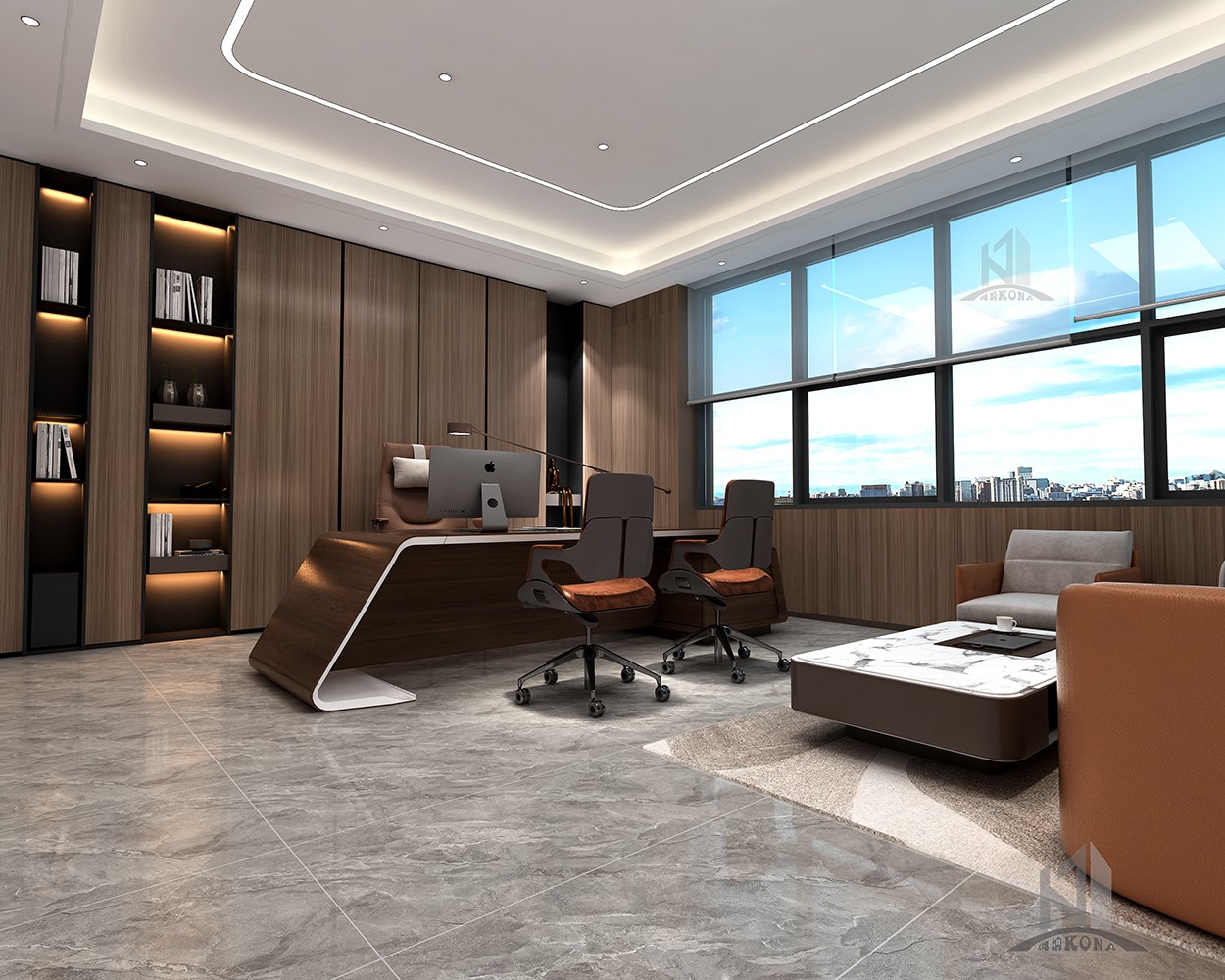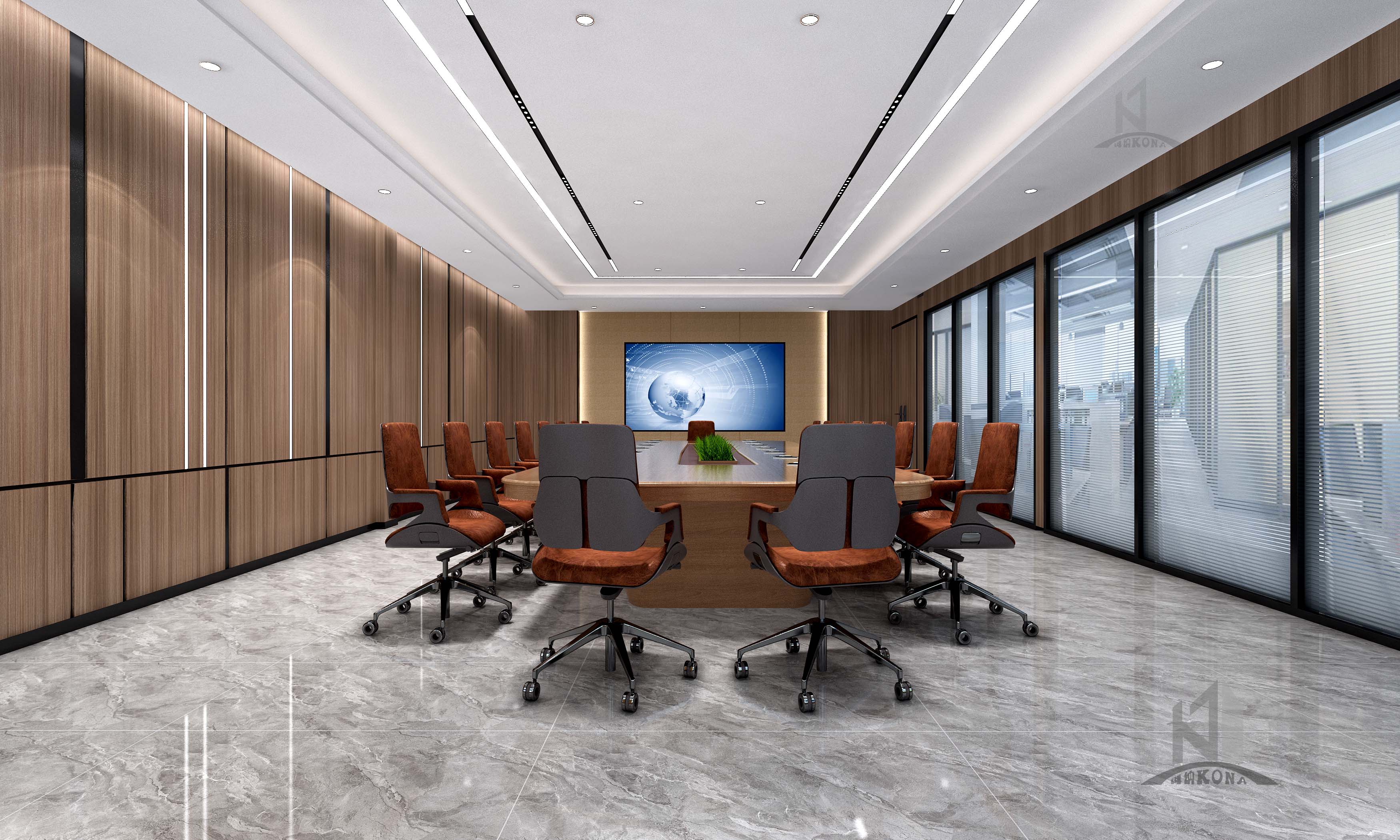 設(shè)計理念:傳統(tǒng)企業(yè)融合時代新審美辦公室設(shè)計,大塊面的灰色系大理石穿插現(xiàn)代感的線條構(gòu)建了大家對于公司的初見印象,然而這種高級的現(xiàn)代感或許會顯得冰冷。但加上了深棕色的實(shí)木就又為公司的前臺注入了儒雅、沉淀與質(zhì)樸的大氣,無論時空如何轉(zhuǎn)換,刻在中國人骨子里的中式風(fēng)骨,千百年后依然在我們的設(shè)計語言中,獵獵作響。辦公室頂面用線條強(qiáng)調(diào)虛實(shí)及縱深,以實(shí)木構(gòu)件表達(dá)建筑語言,干凈簡潔的辦公區(qū)域加上了更加濃墨重彩的傳統(tǒng)中式風(fēng)格細(xì)節(jié),于寂靜無聲中展露中國歷史人文的厚重,還有更多現(xiàn)代與傳統(tǒng)融合的可能性。會議室呈簡潔大氣,端莊肅穆的風(fēng)格,彌漫著一點(diǎn)莊重的儀式感,深棕色、灰色、白色互相融合搭配,這個色系顯得純粹而有力量,在純凈的空間里,人們更容易獲得精神的沉淀,也更容易探尋到真誠的本質(zhì)。除此之外,利用巨大的落地窗,可以減輕空間的沉悶,中和會議室的氛圍。