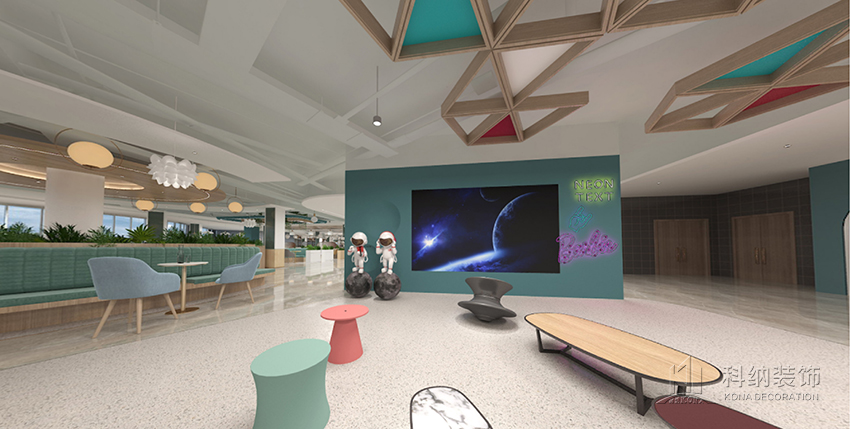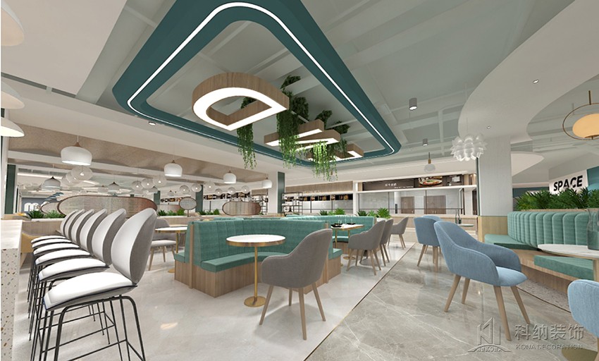 設(shè)計理念:空間設(shè)計力在突破傳統(tǒng)食堂形式,表達(dá)校園食堂快樂食間品牌意識,傳遞快樂食間價值觀。為學(xué)生和老師提供有品位的就餐環(huán)境,享受美食之外還具有學(xué)習(xí)、聚會、獨處的空間功能。整體空間在以白色為主基調(diào)的設(shè)計中,將天花裝飾藍(lán)色,柱子選用了一點墨綠色進(jìn)行點綴,以注入環(huán)保、科技、自然等元素,呈現(xiàn)出美感與實用兼?zhèn)涞膭?chuàng)新設(shè)計。木質(zhì)桌椅溫潤自然,大盆綠植規(guī)律擺放,搭配錯落有致,整個空間自然開闊。