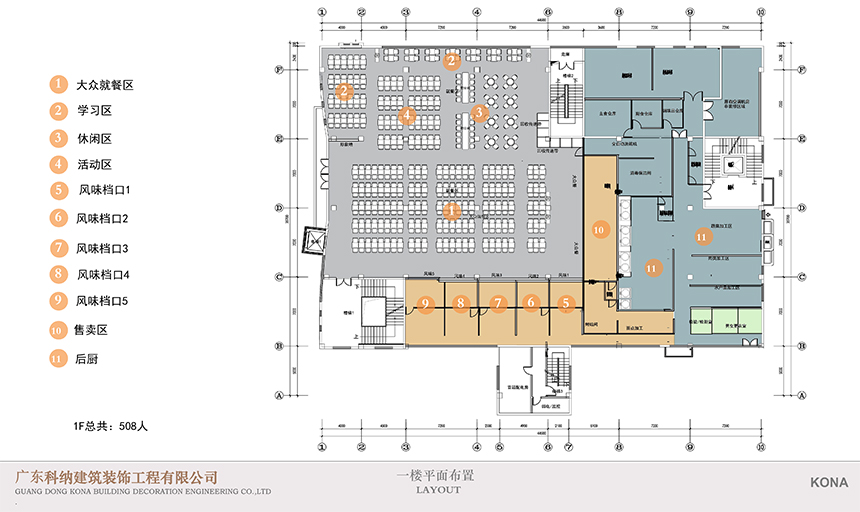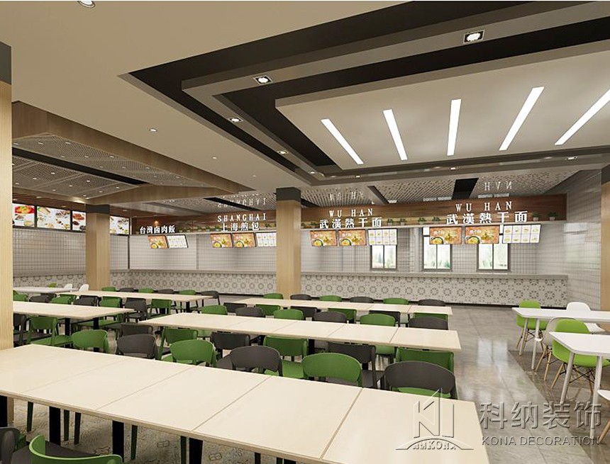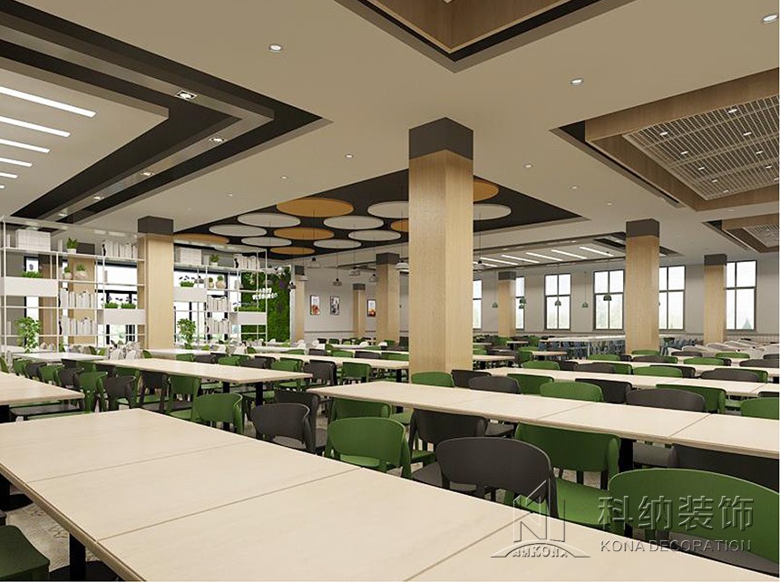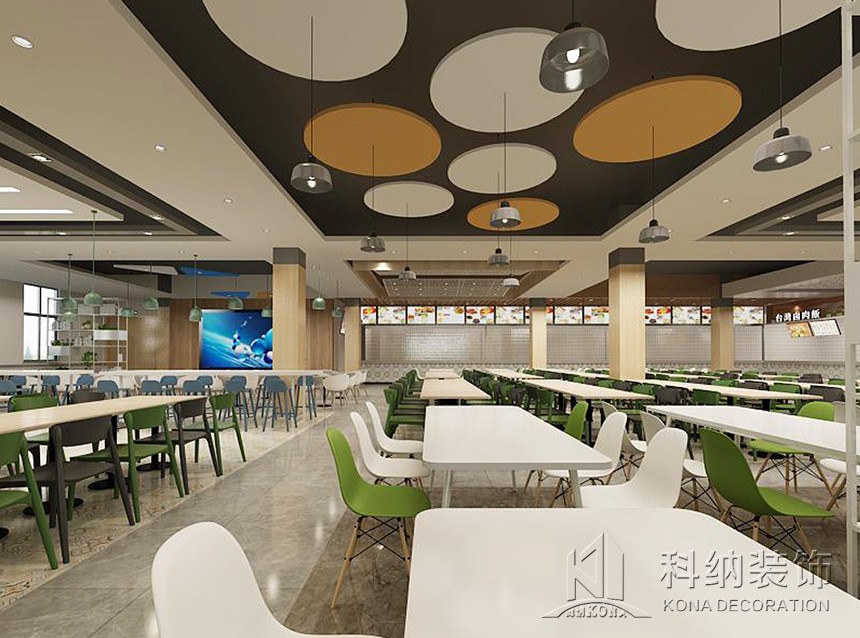 設(shè)計(jì)理念:休閑區(qū)的設(shè)計(jì)應(yīng)用鮮艷色彩,課后的學(xué)生來(lái)到體驗(yàn)休閑愜意讓人心曠神怡。學(xué)術(shù)交流區(qū)應(yīng)用了可組合的桌椅做搭配,造型吊燈使整個(gè)空間顯得生動(dòng)有趣考慮到多人活動(dòng),方便學(xué)生自由組合。團(tuán)體就餐區(qū)橫向舒展的開(kāi)放式桌椅布局給予一層空間通透且自由的氛圍,由此顯露出交互的趣味性與工作的靈活性。大眾就餐區(qū)的設(shè)計(jì)以暖色調(diào)為主,以色彩鮮艷的桌椅做點(diǎn)綴,為空間增加活躍氣息。
