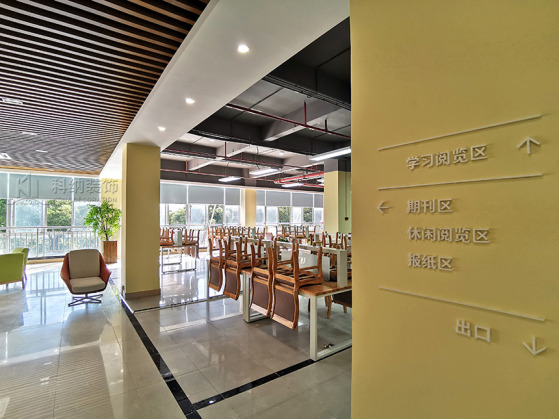此次項(xiàng)目是廣東科技學(xué)院南城校區(qū)圖書館閱覽室裝修工程。整個(gè)圖書館閱讀空間主色調(diào)定為白色、木色、淡綠色,還原清新自然的氛圍,喚醒青春歲月與校園生活氣息。