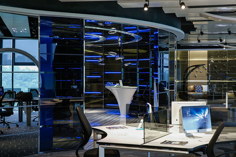 夸張、高冷,經(jīng)典黑白灰是現(xiàn)代科技風(fēng)格的基本畫風(fēng),這類辦公室象征著科技、前沿、和未來感。