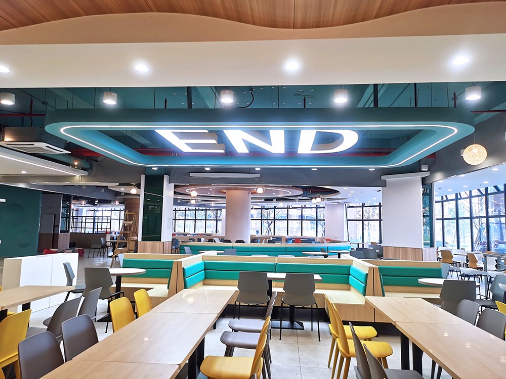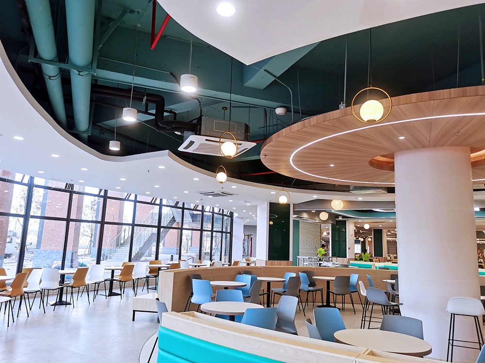 設計理念:空間設計力在突破傳統(tǒng)食堂形式,表達校園食堂快樂食間品牌意識,傳遞快樂食間價值觀。為學生和老師提供有品位的就餐環(huán)境,享受美食之外還具有學習、聚會、獨處的空間功能。整體空間在以白色為主基調(diào)的設計中,將天花裝飾藍色,柱子選用了一點墨綠色進行點綴,以注入環(huán)保、科技、自然等元素,呈現(xiàn)出美感與實用兼?zhèn)涞膭?chuàng)新設計。木質(zhì)桌椅溫潤自然,大盆綠植規(guī)律擺放,搭配錯落有致,整個空間自然開闊。
